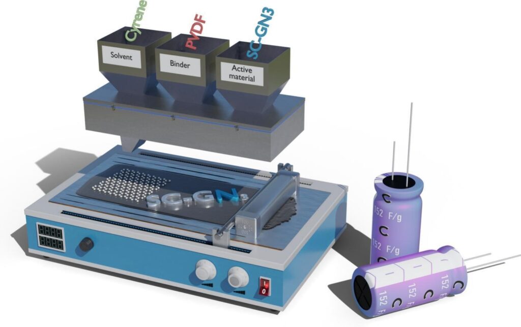 The electrodes were prepared using nitrogen-doped graphene as the active material in combination with two types of binders. The first was a common fluorinated binder (PVDF), which is widely used in industry, including in the manufacturing of battery electrodes. The researchers also tested a fluorine-free binder (PVP), which has a lower environmental impact and is more soluble in environmentally friendly solvents. Using various combinations, they monitored the performance and stability of the electrodes as well as their mechanical resistance.